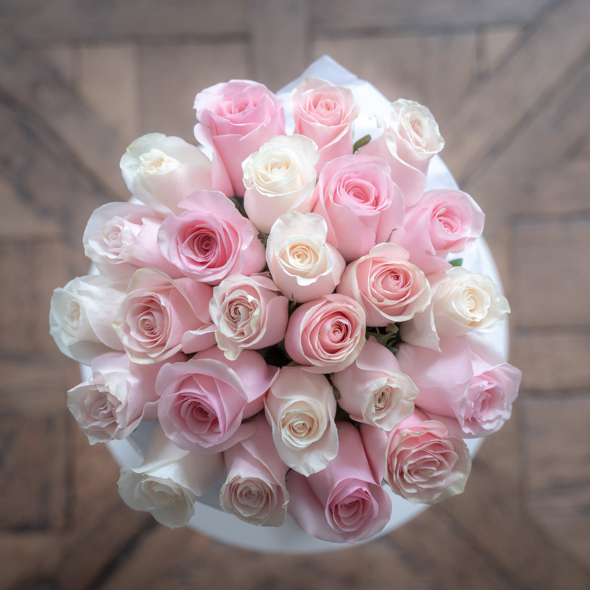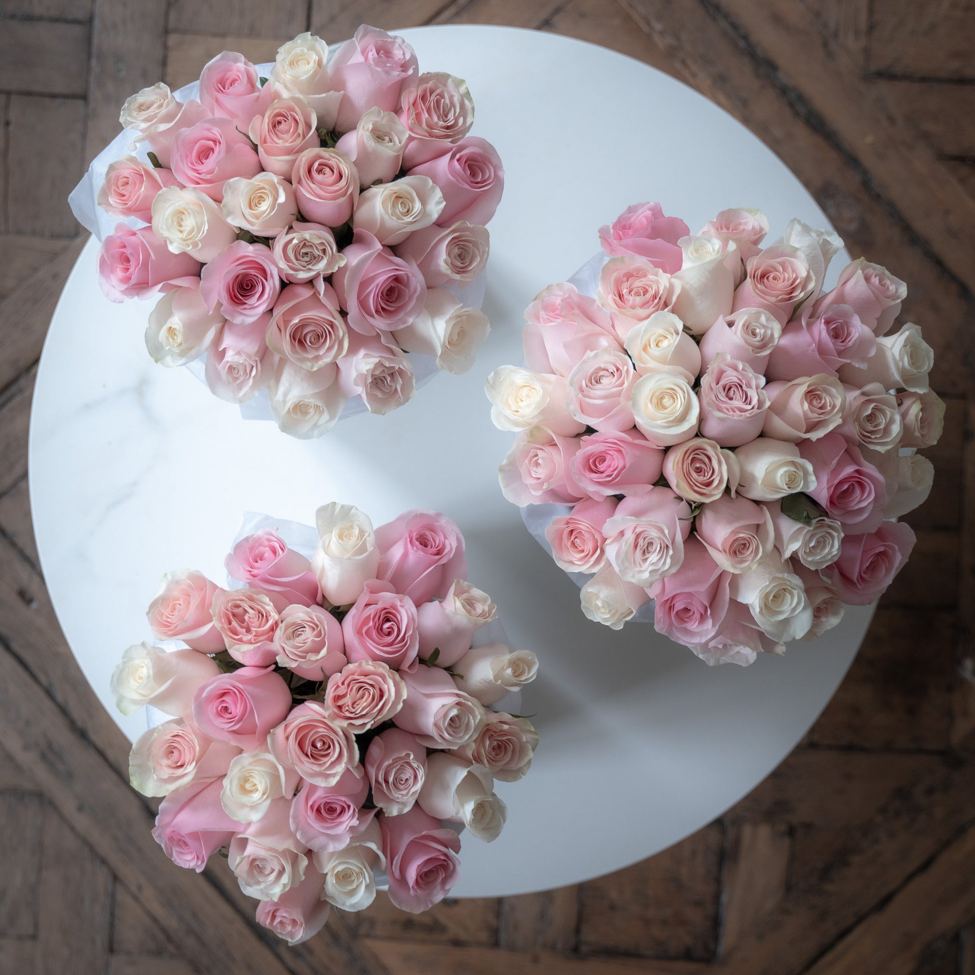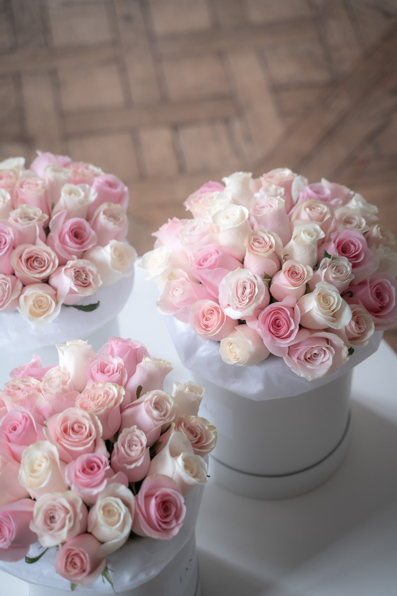 Combining three varieties of soft pink roses complemented by cream Vendela roses, this is a classic way to express romance this Valentine's Day.